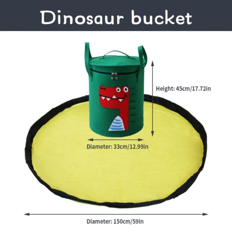 Toy storage bag with matching lid measures 17.72"/45cm tall with a 12.99"/33cm diameter. The attached 59"/149cm removable play mat keeps toys contained. It has ample space to store toys and play.